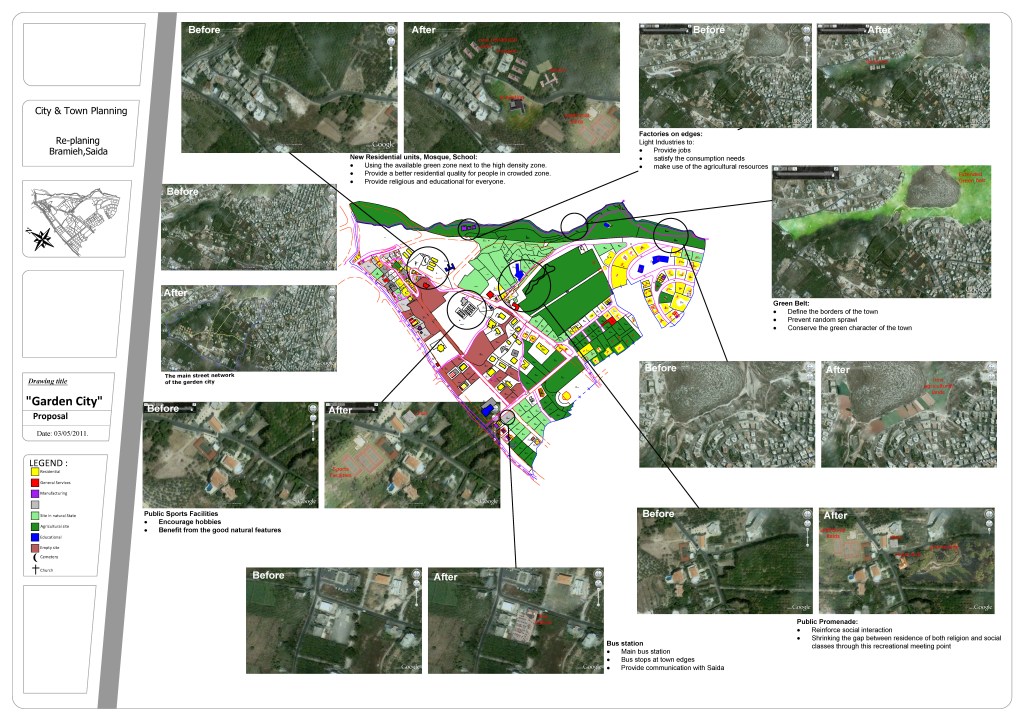 The “Revitalizing Bramiyeh” project presents an evidence-based approach to urban re-planning in the town of Bramiyeh, aiming to fulfill the various needs of its residents while achieving sustainable development. Drawing from extensive research, including land-use mapping, interviews with residents, SWOT analyses of different zones, and the principles of “New Urbanism,” the project proposes a “Garden City” concept for the town’s future development.